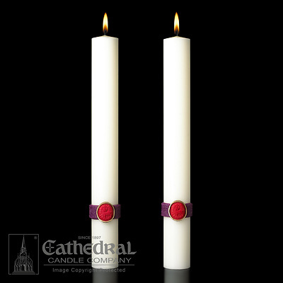 Every Eximious candle from Cathedral is individually hand-made with intricate inlays, rich onlays, and classic sculptured engravings. The Cross of the Lamb Complementing altar candles feature engraved red and purple bands designed to match the