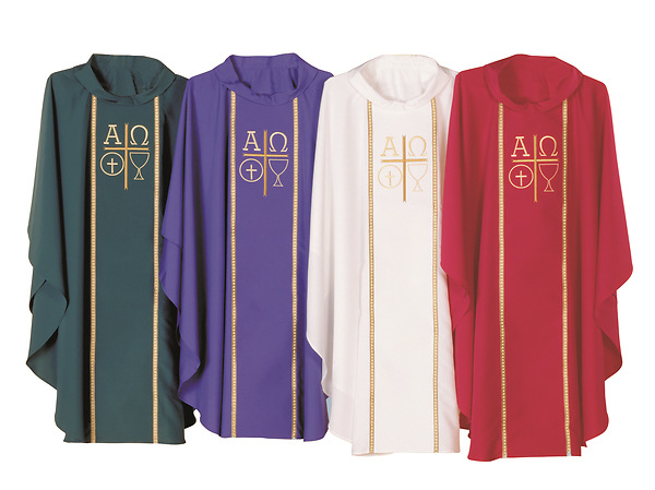 The Alpha 6060 Series Chasuble is made in the USA of Liberty fabric (100% polyester) with an Alpha/Omega and Chalice/Wafer symbol on the four quadrants of the Cross. The chasuble is unlined for lightweight comfort, has a rolled collar and includes matching Eucharist stole. Standard size is 58" wide, by 52" in length. Available in Green, Purple, White, or Red.
