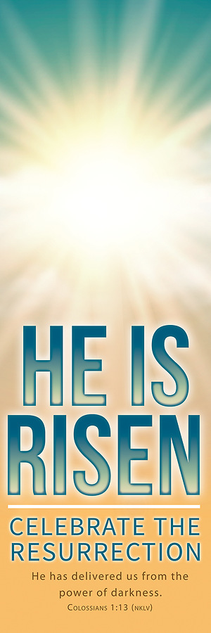 This Easter banner features a gold and blue sky with the text: He is Risen, Celebrate the Resurrection, He has delivered us from the power of darkness Col 1:13.