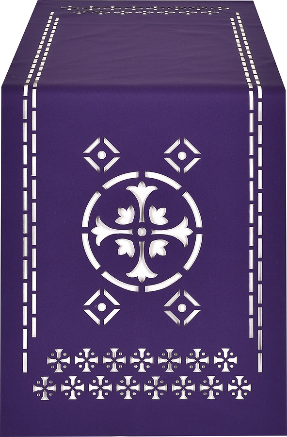 The Ecclesiastical Collection unlined altar overlay features a unique lattice design that allows the altar or altar cloth to be partially seen though the overlay. Available in Blue, Green, Purple, and Red. Dimensions: 18" wide by 50" long. Made in the USA.