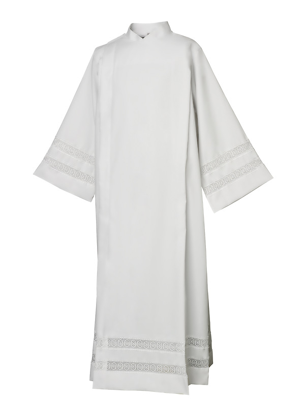 This alb is made of a 65% polyester/35% cotton blend and features a button closure. Also available with a Velcro closure (see SP219760). Features double row lace inserts on each sleeve and the bottom of the alb. Made in the USA.