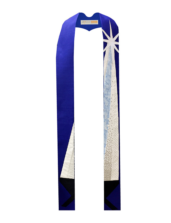 In our Manger stole the Star of Bethlehem shines brightly on the manger where the Christ Child lays. Available on your choice of blue or purple silk dupioni with a silver pleather star, cotton prints and black silk dupioni.  104" and 112" long.