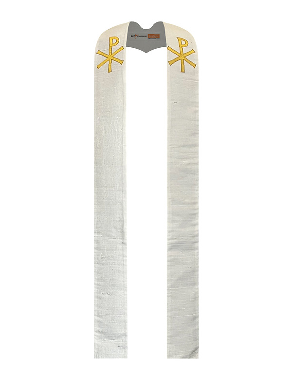 Luxurious silk dupioni adorned with an appliqued antique gold Chi Rho on the chest of each side create a timeless, classic look. This design works perfectly for virtual worship as the design is at the chest and visible on screen. 104" and 112" long.