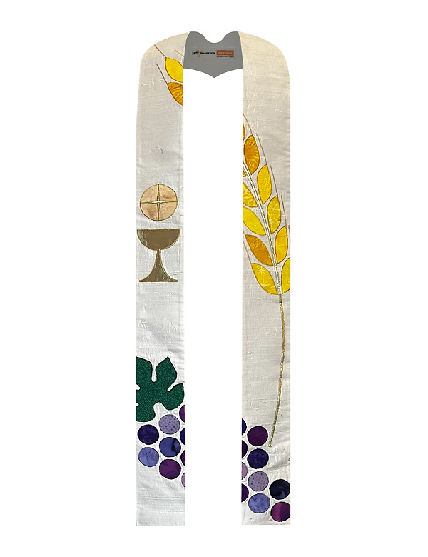 The Ephesus Stole is made of silk dupioni and combined with a variety of cotton prints and batiks to create this beautiful, simple stole. This stole is 5" wide with a 1" strip of cotton prints and batiks down the center of each side of the stole. 104" and 112" long.