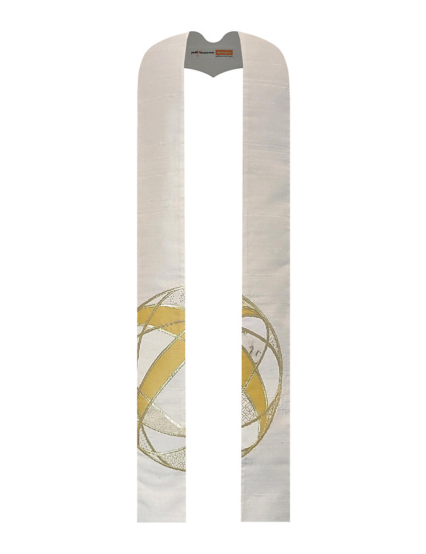 Our For God So Loved the World stole is a base of silk dupioni with overlapping circles of gold lame` to create a cross of gold wrapped around the Earth. The shapes between the lines are filled in with cotton prints and batiks creating an elegant and meaningful design. 104" and 112" long.
