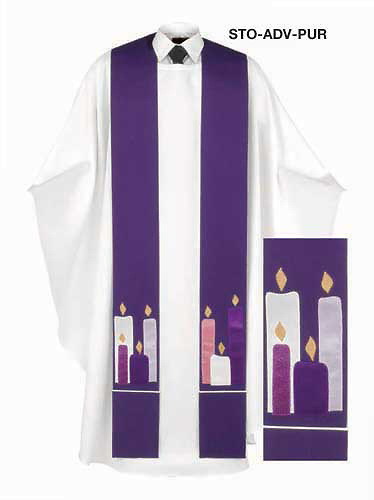 Appliqued satin candles in assorted colors on lower panels of purple stole