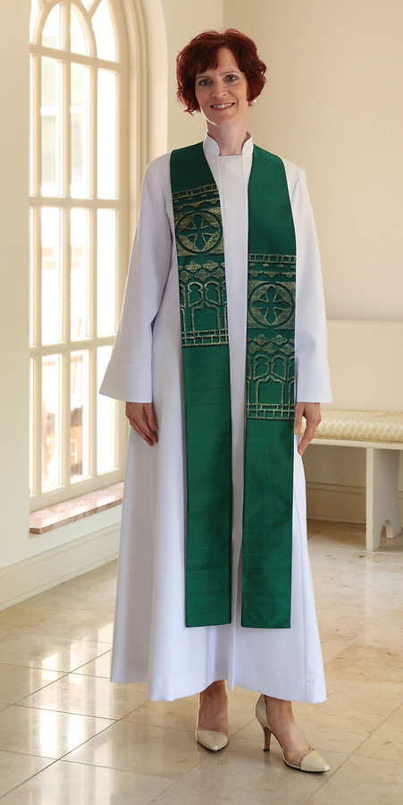 Each Abbey stole is a work of art, no two are exactly alike. The image is created by a hand-carved wood block stamped on the silk; each meticulously hand stamped one at a time. There will be slight variations in the color of the print on the silk. The fabric is vibrant silk Dupioni. The stole has a curved neck design allowing it to lay so much better than a straight or v-style stole. It is 5” wide and comes in two lengths: Petite (96”) and Average/Tall (104”). This stole is available in blue, green, purple, red, vanilla, and white. The standard design has the patterns set asymmetrically. Please see SP218947 for symmetrical design.