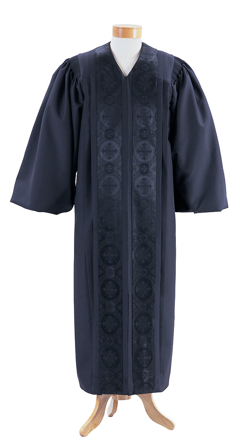 Beautiful pulpit robes to be worn with distinguished pride and comfort. These robes are tailored by expert craft people to standard sizes. Medium weight Liberty 100% polyester provides for a fine drape yet comfortable in all climates. Majestically adorned with rich velveteen panels either plain or embroidered with Latin Cross. Matching cording outlines side pleats. Double lined sleeves with cuff for a bell effect sleeve. Full precision fluting across shoulder and back gives beautiful drape.