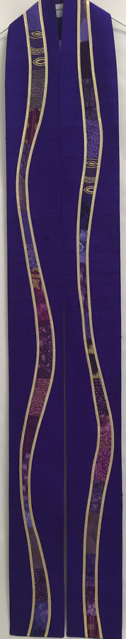 The River of Life design features a selection of cottons in a range of prints, solids, and batiks meandering down a background of dupioni silk, and outlined in gold lame. Available in green, blue, red, purple, white and even number lengths from 96" to 116".