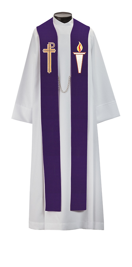 The 5412 Meditation Stole is applique with satin-stitch embroidery featuring a standard style with tapered neckline. Made in the USA. This stole can be purchased in many different fabrics and patterns. See the fabric guide on the "Content" tab to determine what material each fabric/pattern is made of. Choose the fabric/pattern from the drop down menu above to determine pricing. Comes in 2 standard sizes -100" or 112" length. May be ordered in custom sizes. Please call our custom sales team at 1-800-237-7511 for additional help. **This piece is custom made and is therefore non-returnable. Please allow up to eight weeks for delivery**