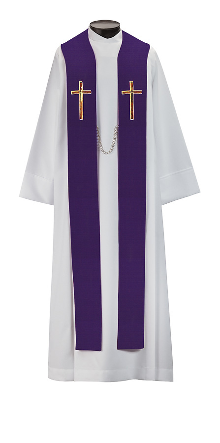 The 5270 The Last Supper Stole is applique with satin-stitch embroidery featuring a standard style with tapered neckline. Made in the USA. This stole can be purchased in many different fabrics and patterns. See the fabric guide on the "Content" tab to determine what material each fabric/pattern is made of. Choose the fabric/pattern from the drop down menu above to determine pricing. Comes in 2 standard sizes -100" or 112" length. May be ordered in custom sizes. Please call our custom sales team at 1-800-237-7511 for additional help. **This piece is custom made and is therefore non-returnable. Please allow up to eight weeks for delivery**