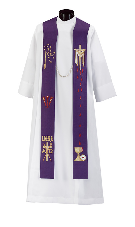 The 5001 In Remembrance of Me Stole is applique with satin-stitch embroidery featuring a standard style with tapered neckline. Made in the USA. This stole can be purchased in many different fabrics and patterns. See the fabric guide on the "Content" tab to determine what material each fabric/pattern is made of. Choose the fabric/pattern from the drop down menu above to determine pricing. Comes in 2 standard sizes -100" or 112" length. May be ordered in custom sizes. Please call our custom sales team at 1-800-237-7511 for additional help. **This piece is custom made and is therefore non-returnable. Please allow up to eight weeks for delivery**