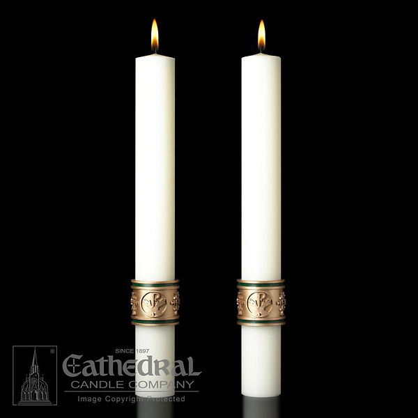 These attractive Altar Candles act to enhance the presence of the Paschal Candle - a perfect decorative touch!. 51% Beeswax. Sold as pair. Made in the USA.